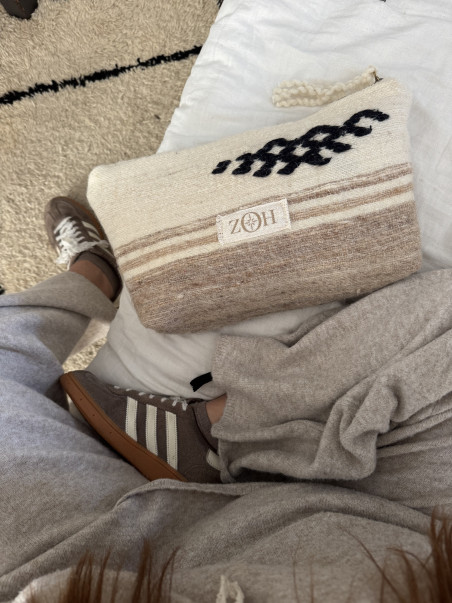 Teddy pouch in ecru terry Lined in ecru cotton with zipper Featuring a leather shoulder strap, can hold a smartphone and other small essentials Size 30x20cm Shoulder strap 122cm Handcrafted in small series